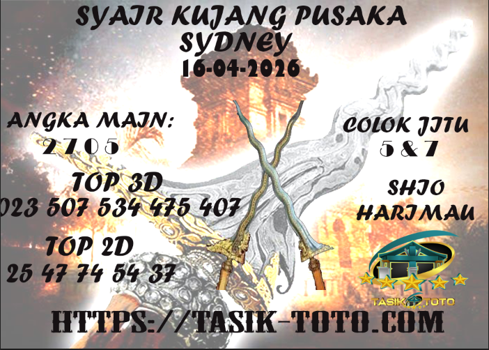 Prediksi TasikToto hari ini berpatisipasi untuk menyebarkan info syair togel sydney akurat untuk bettor togelers. Pada umumnya syair togel ini memiliki muatan rangkuman prediksi shio atau ramalan shio yang tujuannya benar-benar berguna bagi beberapa prediktor dalam mendapati angka keluaran dari ramalan angka togel ini.